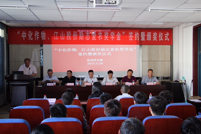 5月20日,由南通江山農(nóng)藥化工股份有限公司與中化作物保護品有限公司聯(lián)合捐助的“中化作物、江山股份勵志愛農(nóng)獎學金”簽約暨首次頒獎儀式在石河子大學農(nóng)學院隆重舉行。公司黨委副書記茅云龍、中化作物副總經(jīng)理王權、石河子大學校長助理楊新泉、農(nóng)學院黨委副書記艾尼瓦爾等校院領導以及校輔導員、學生代表參加了簽約及頒獎儀式。