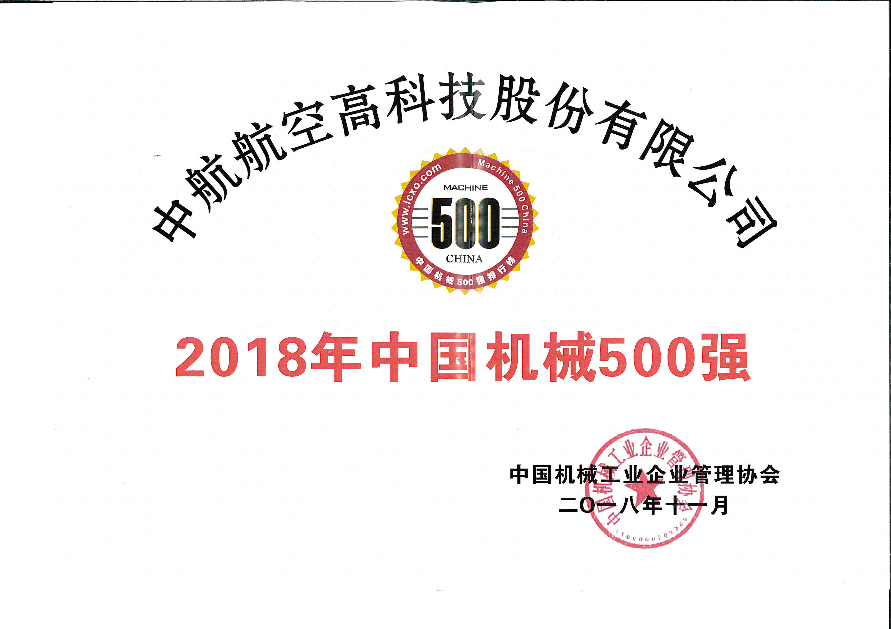 中航高科榮獲“中國機械500強”榮譽稱號