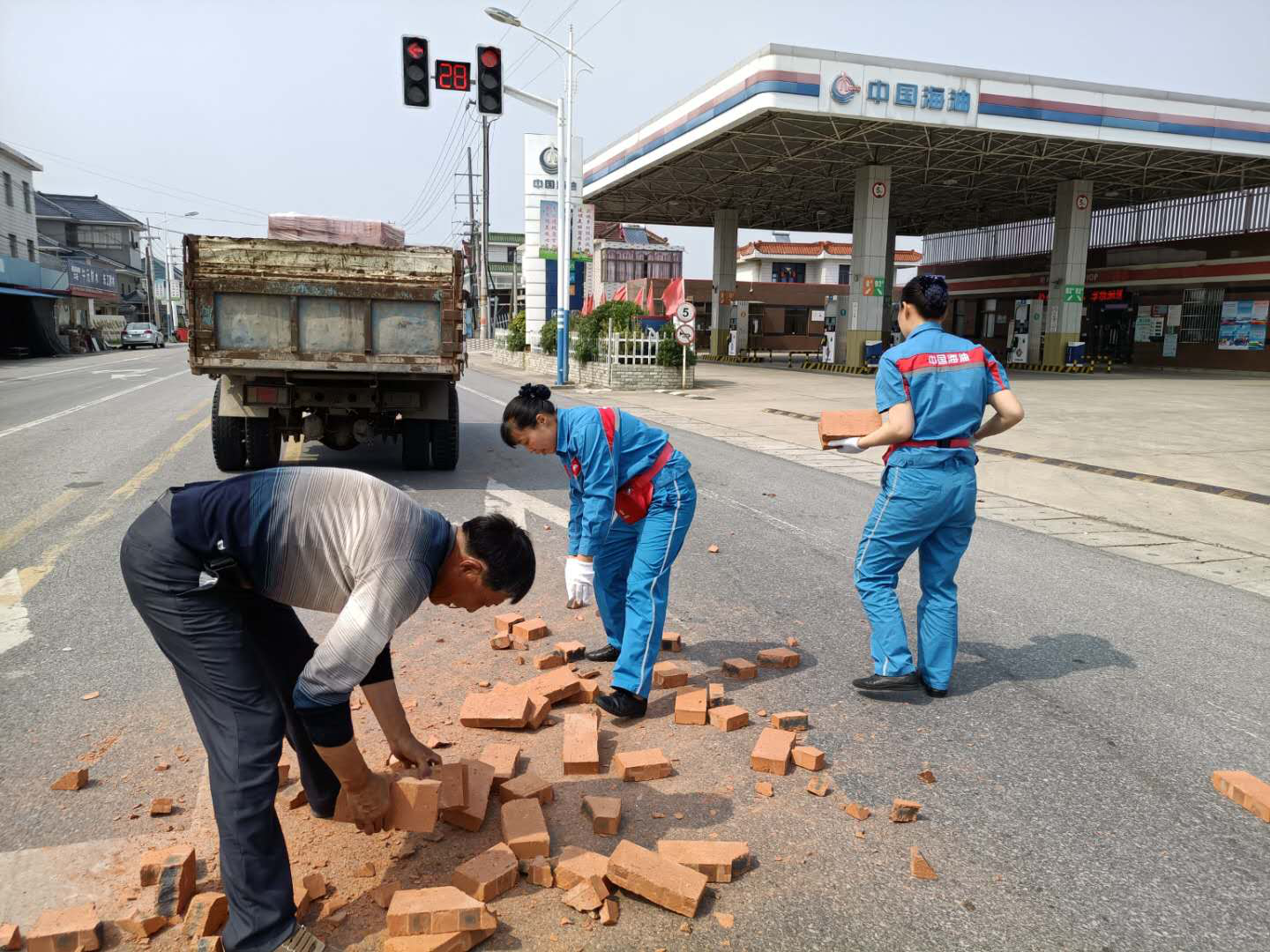 夏天的中午,天氣炎熱,似乎連樹上的知了也停止了歌唱。華東銷售南通公司栟茶加油站站前道路,似乎和往常一樣,車輛人流來來往往,當班的繆小紅和蔡翠和頂著炎熱在加油島上等待下一個顧客來加油。突然,“吱呀~~~”一個急剎,一輛避讓行人的運磚車差點翻車,晃悠了幾次總算停穩(wěn)了,但是車上的磚塊紛紛滾落。后方行駛的車輛有些來不及避讓,差點釀成新的事故,散落的磚塊對道路交通安全構(gòu)成隱患。司機驚魂未定,趕忙下車查看,立刻開始將散落在道路上的磚往車上搬。